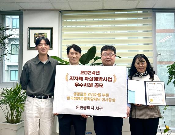 [메이저뉴스]인천 서구는 자살예방사업 우수사례 공모 ‘생명존중 안심마을’ 부문에서 한국생명존중희망재단 이사장상을 수상했다고 밝혔다.