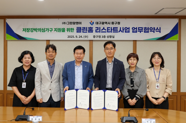 [메이저뉴스]대구 중구와 ㈜그린알앤이(대표 이근수)는 24일 저장강박의심가구 주거환경 개선과 복지안전망 강화를 위한 ‘클린홈 리스타트 사업’ 업무협약을 체결했다.