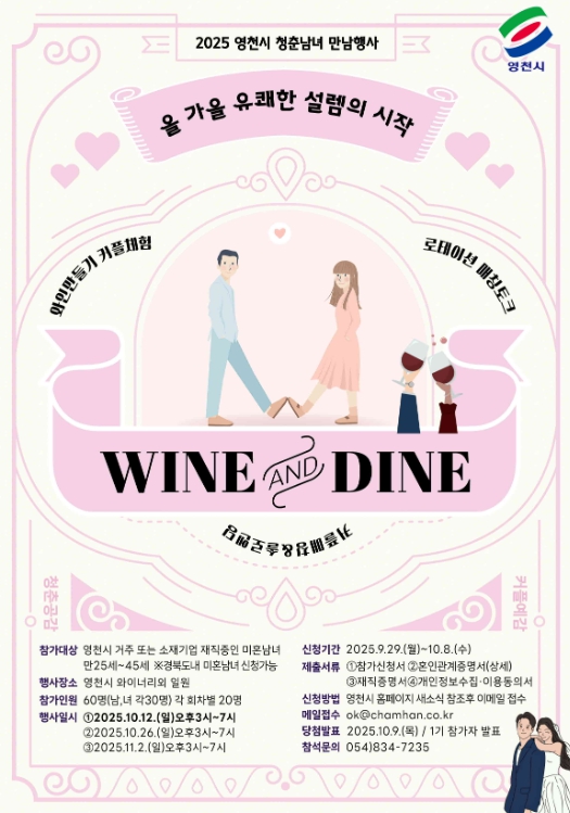 [메이저뉴스]영천시는 오는 10월 12일, 10월 26일, 11월 2일 세 차례에 걸쳐 관내 와이너리에서 미혼남녀를 위한 특별한 만남 프로그램 ‘2025 영천愛 와인·다인(wine·dine)’을 개최한다.