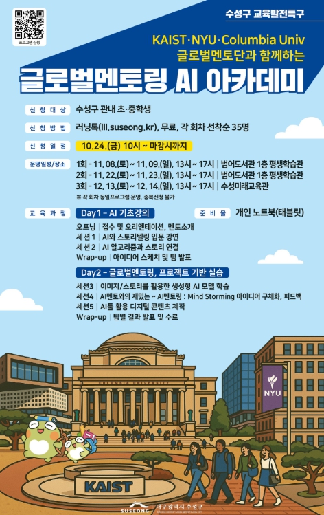 [메이저뉴스]대구 수성구는 오는 11월 7일 범어도서관 김만용·박수년홀에서 ‘글로벌 교육 전문가와 함께하는 수성 AI 인재 미래교육 포럼’을 개최하고, 연계 프로그램인 AI 아카데미를 통해 미래세대를 위한 교육혁신과 글로벌 협력의 출발점을 연다.