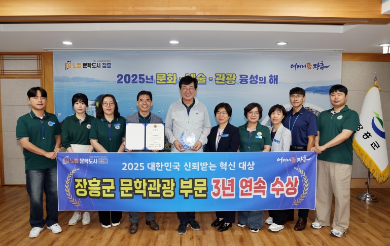 [메이저뉴스]장흥군이 9월 29일 개최한 ‘2025 대한민국 신뢰받는 혁신대상’시상식에서 문학관광 부문 공공혁신 대상을 수상했다고 밝혔다.