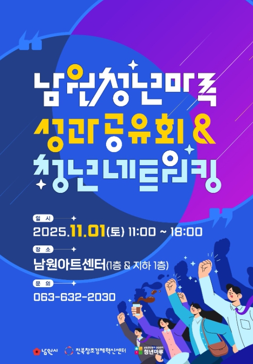 [메이저뉴스]남원시는 청년활동 거점공간인 ‘청년마루’의 한 해 성과를 시민과 함께 공유하고, 지역 청년들이 서로 소통하며 새로운 가능성을 모색하는 '2025 남원 청년마루 성과공유회 · 청년네트워킹 데이'를 11월 1일남원 아트센터에서 개최한다.