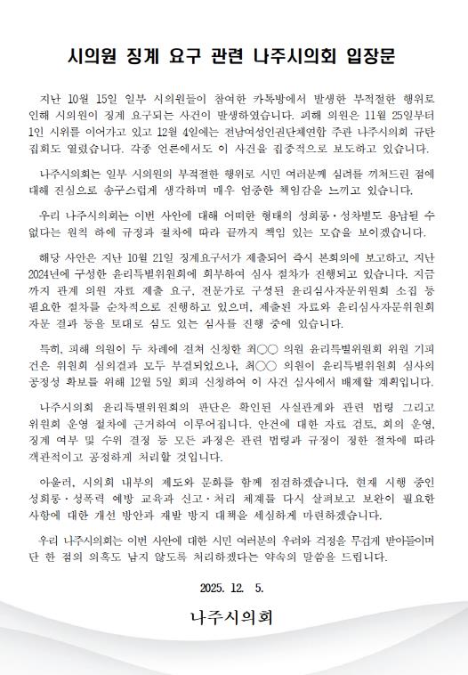 [메이저뉴스]나주시의회는 지난 10월 15일 일부 시의원들이 참여한 카카오톡 대화방에서 발생한 부적절한 행위로 징계 요구가 제기되고, 피해 의원의 1인 시위와 여성단체 규탄 집회, 언론 보도가 이어진 상황과 관련하여 12월 5일 공식 입장문을 발표했다.
