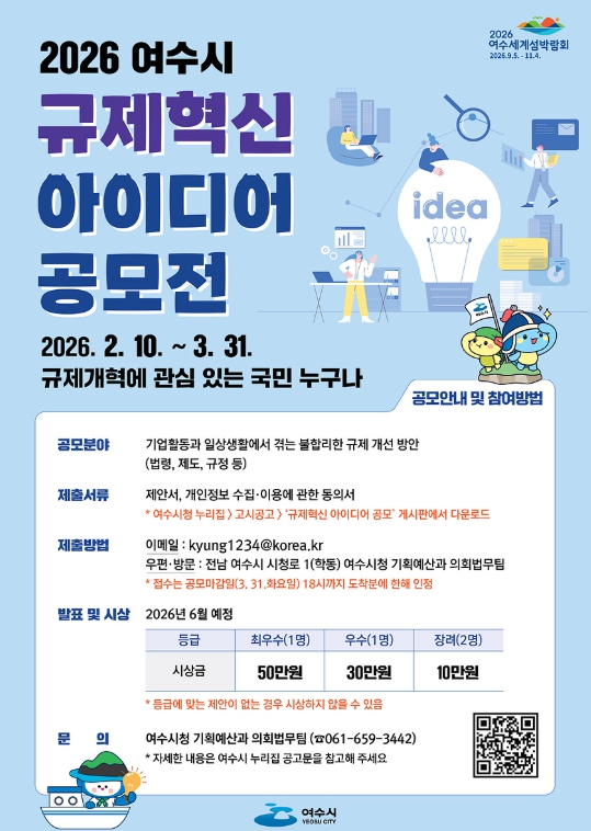 [메이저뉴스]여수시는 오늘(10일)부터 3월 31일까지 법령이나 조례 등에 과도한 규제로 시민의 일상생활에 불편을 주거나 기업 경영활동에 걸림돌이 되는 불합리한 사항을 발굴·개선하기 위해 “2026년 여수시 규제혁신 아이디어 공모전”을 실시한다.