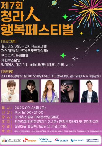 [메이저뉴스]인천 서구 청라2동 행정복지센터는 오는 9월 26일 금요일 오후 4시부터 청라호수공원 야외음악당에서 ‘제7회 청라인 행복 페스티벌’을 개최한다고 22일 밝혔다.
