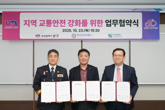 [메이저뉴스]부산 남구는 지난 10월 23일, 부산 남부경찰서 및 도로교통공단 부산광역시지부와 함께‘지역 교통안전 강화를 위한 업무협약’을 체결했다고 밝혔다.