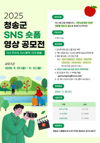[메이저뉴스]청송군은 산소카페 청송군의 대표 관광지와 축제를 널리 알리고 온라인 홍보를 활성화하기 위해 '2025 청송군 SNS 숏폼 영상 공모전'을 개최한다고 밝혔다.