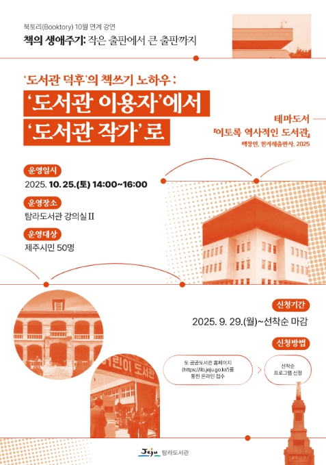 [메이저뉴스]제주시 탐라도서관은 제주시민들의 독서 생활을 증진하고 책을 통한 소통의 장을 마련하기 위해 오는 10월 25일 오후 2시 강의실Ⅱ에서 북토리 강연을 개최한다.