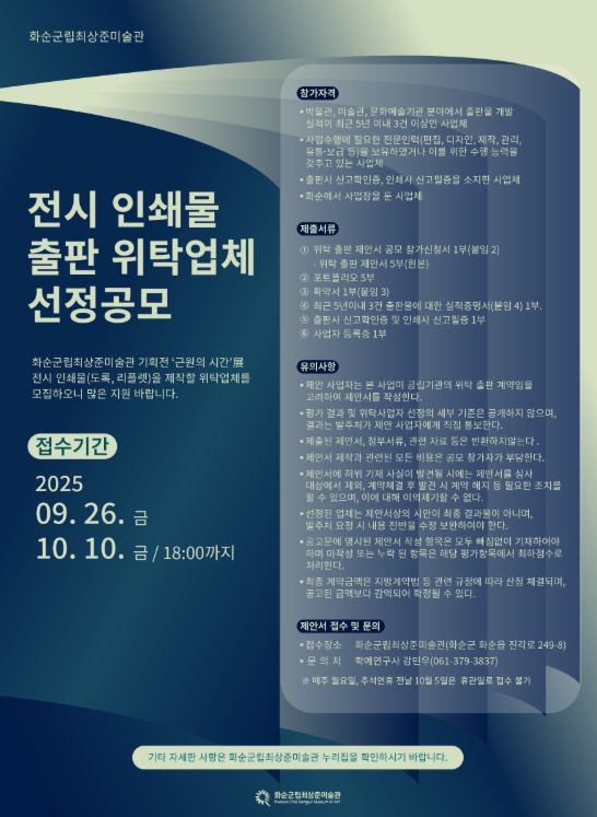 [메이저뉴스]화순군은 29일 화순군립최상준미술관 기획전 ‘근원의 시간’ 展의 전시 인쇄물(도록, 리플렛) 제작을 전문적으로 수행할 위탁업체를 공개 모집한다고 밝혔다.