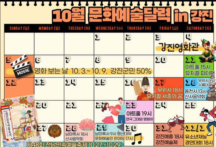 [메이저뉴스]강진군은 선선한 가을바람과 함께 군민의 문화적 감수성을 채워줄 다채로운 문화예술 행사를 10월 집중 운영한다고 29일 밝혔다.