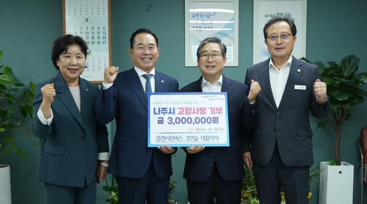 [메이저뉴스]전라남도 나주시는 춘천시민버스 강연술 대표(왼쪽 두번째)가 지난 25일 지역사회 발전을 위해 고향사랑기부금 300만 원을 기탁했다고 밝혔다.