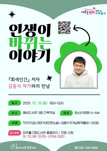 [메이저뉴스]인천 미추홀구 용비도서관은 오는 10월 19일 청소년을 위한 특별한 북콘서트 ‘인생이 바뀌는 이야기’를 개최한다.
