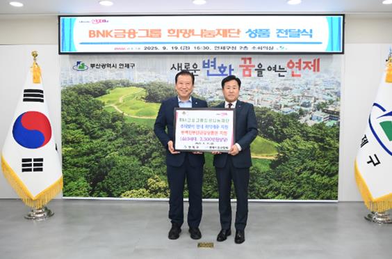 [메이저뉴스]연제구는 9월 19일 BNK금융그룹 희망나눔재단으로부터 저소득 취약계층을 위한 동백전 선불카드(부산지역화폐 2,300만 원 상당)를 기탁받았다.