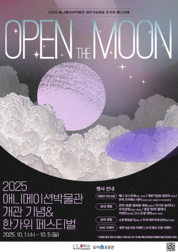 애니메이션박물관장은 “올해 ‘오픈 더 문(Open the Moon)’은 단순한 추석 명절 프로그램을 넘어, 애니메이션과 전통이 만나 세대와 지역을 잇는 문화 축제로 기획했다”며, “박물관을 찾는 가족들이 올 가을 특별한 시간을 보내며 오래도록 기억할 추억을 만들어 가길 바란다.”고 전했다.