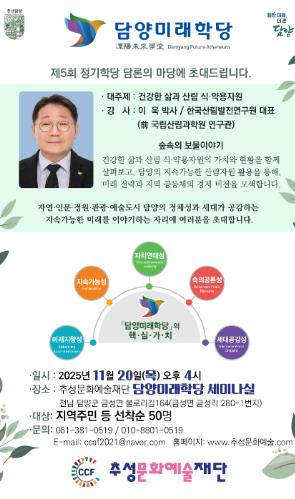 [메이저뉴스]추성문화예술재단이 운영하는 담양미래학당은 오는 11월 20일 오후 7시, 담양군 금성면에 위치한 담양미래학당 세미나실에서 제5회 정기학당 담론마당을 개최한다.
