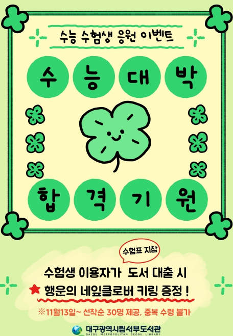 이벤트 기간 동안 수험생이 수험표를 지참해 도서관을 방문하고 도서를 대출하면 ‘행운의 네잎클로버 키링’을 선물로 받을 수 있다.