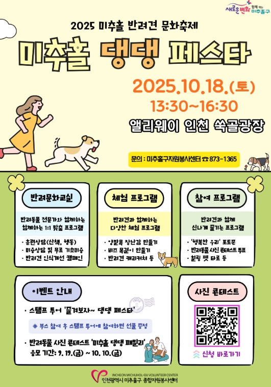 [메이저뉴스]인천 미추홀구종합자원봉사센터는 오는 10월 18일 앨리웨이 인천 쑥골광장에서 ‘2025년 미추홀 반려견 문화축제 미추홀 댕댕 페스타’를 개최한다.