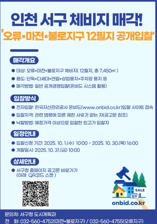 [메이저뉴스] 인천 서구는 오는 10월 1일부터 30일까지 오류, 마전, 불로지구 토지구획정리사업구역 내 체비지 12필지를 일반 공개경쟁 입찰(전자입찰) 방식으로 매각한다고 밝혔다.
