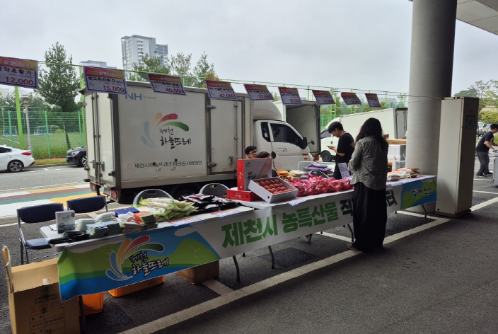 [메이저뉴스]제천시는 지난 9월 30일 충북 오송단지에서 열린 식품의약품안전처 주관 직거래장터에 지역 농산물 판매업소 ‘하늘뜨레’와 함께 참여해, 오송단지 내 6개 입주기관 직원과 주민 등 2,000여 명을 대상으로 지역 특산품을 판매했다.