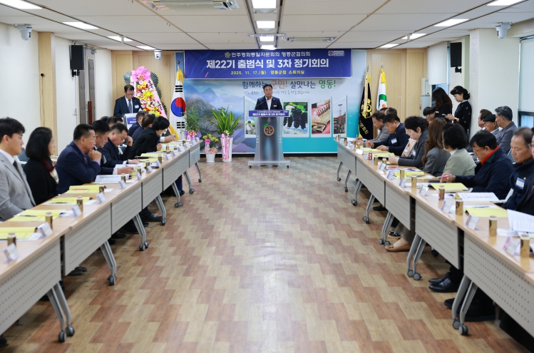 [메이저뉴스]헌법기관이자 대통령 직속의 통일자문기구인 민주평화통일자문회의 영동군협의회(협의회장 박희선)는 17일, 영동군청 소회의실에서 정영철 영동군수, 김병우 충북지역회의부의장, 자문위원 등 50여 명이 참석한 가운데 ‘제22기 출범식 및 2025년 3차 정기회의’(이하‘출범식’)을 개최했다.