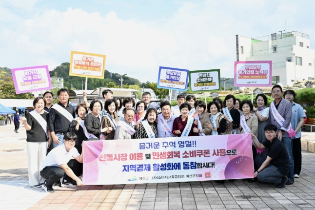 [메이저뉴스] 예산군은 추석 명절을 맞아 지난 9월 30일 예산시장에서 최재구 예산군수와 소비자교육중앙회 예산군지회(회장 고순옥) 회원 등 30여명이 참석한 가운데 전통시장 장보기와 물가안정을 위한 캠페인을 전개하고 민생회복 소비쿠폰 사용을 홍보했다.