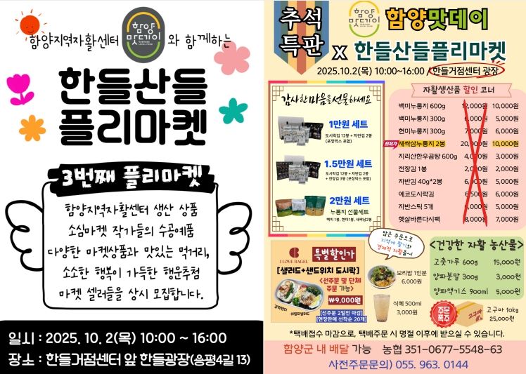 [메이저뉴스]함양군은 10월 2일 오전 10시부터 오후 4시까지 한들거점센터 앞 한들광장에서 ‘한들산들 플리마켓’ 3회차 행사를 개최한다.