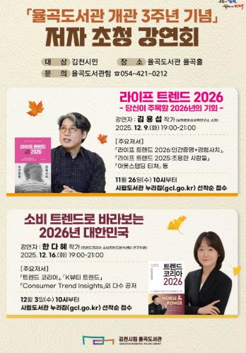 [메이저뉴스]김천시립 율곡도서관은 개관 3주년을 맞아 오는 12월 국내 대표 트렌드 전문가를 초청해 강연회를 개최하고, 참가자를 모집한다.