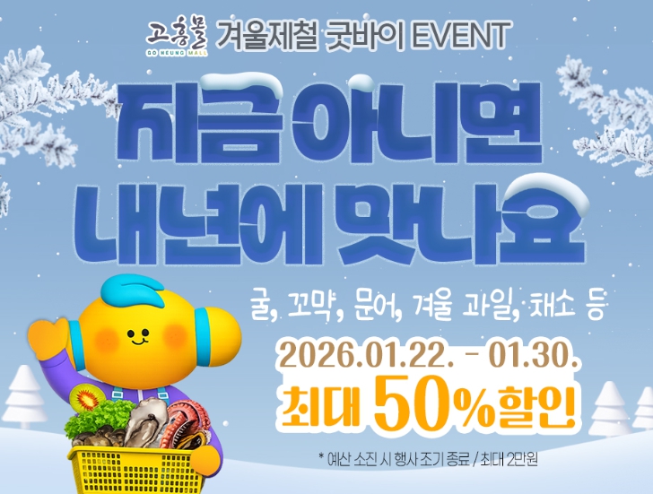 [메이저뉴스]고흥군이 운영하는 온라인 쇼핑몰 고흥몰은 1월 22일부터 30일까지 겨울 제철 농수산물을 최대 50% 할인하는 특별 기획전 ‘지금 아니면 내년에 맛나요’를 개최한다.