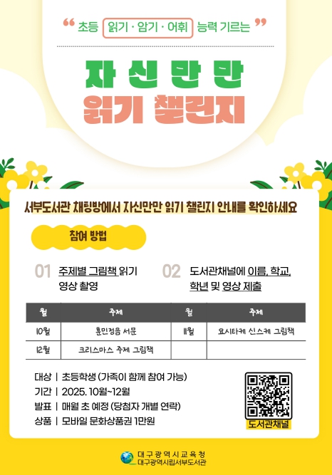 [메이저뉴스] 대구서부도서관은 10월부터 12월까지 초등학생을 대상으로 책 읽기의 즐거움을 느끼고 독서에 대한 자신감을 키울 수 있도록 ‘자신만만 읽기 챌린지’를 운영한다.