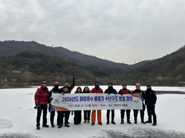 훈련은 얼음이 파손된 긴급상황을 가정하여 인명 추락 구조로 △로프∙사다리, 부력기구를 이용한 안전 접근 △결빙 수난구조 장비 활용 △구조 후 응급처치 및 이송 절차 등 실제 사고 발생 시 현장 중심의 실전형 훈련으로 진행됐다.
