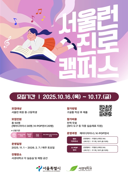 [메이저뉴스] 서울시 대표 교육사다리 ‘서울런’이 청소년의 진로지원과 취업역량 강화까지 책임지는 종합 플랫폼 ‘서울런3.0’으로 도약하는 첫걸음으로 서경대학교와 협력해 예체능 진로 지원을 본격화한다. K-뷰티(헤어·메이크업·네일), K-POP 댄스, 한국어 교육 등 5개 과정을 시범 운영하며, 중·고등학생 서울런 회원 130명을 선발해 11월부터 진행한다.