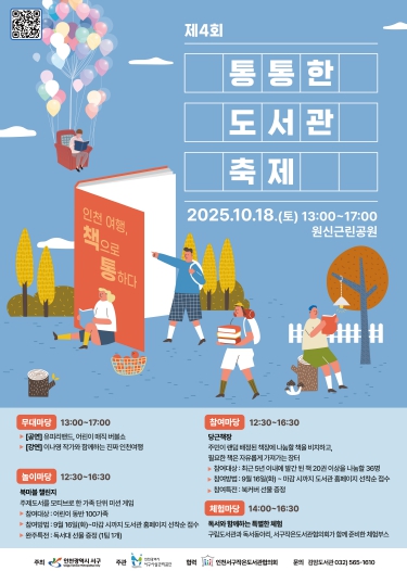 10월 18일 13시~17시에 열리는 ‘제4회 통통한 도서관 축제’에서는 ‘인천 여행, 책으로 통하다’라는 주제로 총 4개(무대마당, 놀이마당, 참여마당, 체험마당)의 행사를 진행한다.
