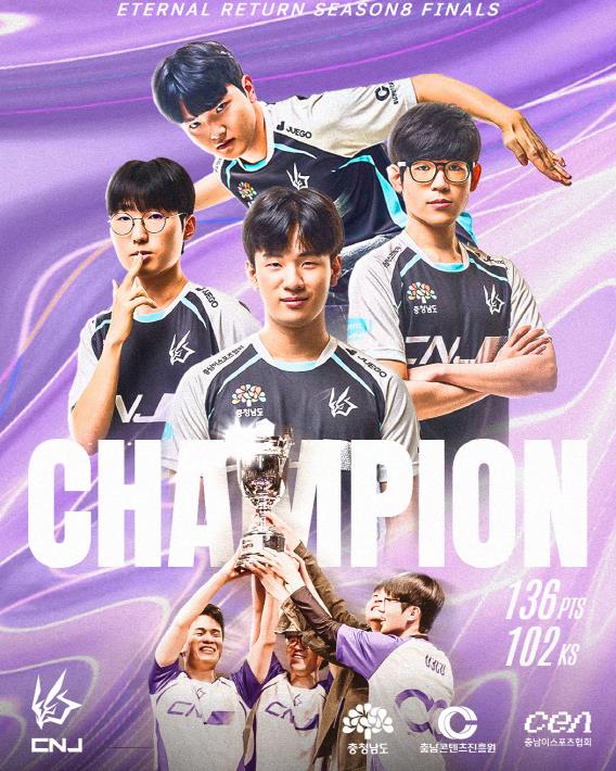 [메이저뉴스](재)충남콘텐츠진흥원은 충청남도를 대표하는 이스포츠 게임단 ‘CNJ Esports가 2025년 10월 12일 대전 드림 아레나에서 열린 이터널 리턴 마스터즈 시즌8 파이널에서 우승을 차지했다고 밝혔다.