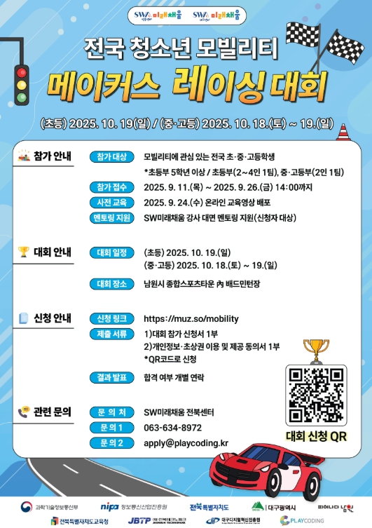 [메이저뉴스]남원시가 오는 10월 18일부터 19일까지 남원종합스포츠타운 내 배드민턴장에서 ‘SW미래채움(전북) 전국 청소년 모빌리티 메이커스 레이싱 대회’를 개최한다.