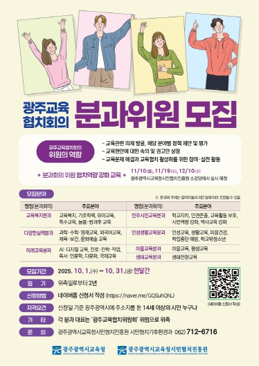 ‘광주교육협치회의’는 지역사회와 함께하는 시민협치 활성화를 위해 지난 2023년 1기를 모집했다. 시민협치진흥원은 1기 위원의 임기가 오는 10월 31일 종료됨에 따라 2기 위원을 모집한다.