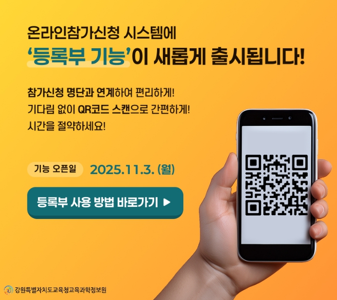 [메이저뉴스] 강원특별자치도교육청교육과학정보원은 ‘2025년 교육포털 시스템 유지관리 사업’의 일환으로, 교육행사 등록 절차의 효율화를 위한 ‘온라인 등록부’ 기능을 새롭게 개발·도입했다고 3일(월) 밝혔다.
