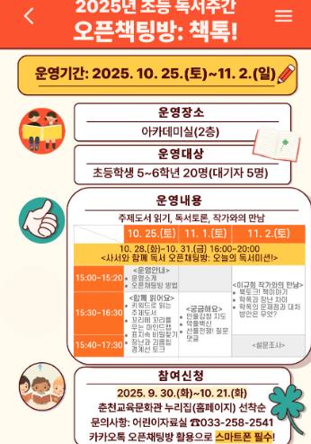 [메이저뉴스]춘천교육문화관은 책 읽기 좋은 계절인 가을을 맞아 오는 10월 25일, 10월 28일부터 11월 2일까지 초등학생 5~6학년 학생 20명을 대상으로 초등 독서주간 ‘오픈책팅방 책톡!’을 운영한다.