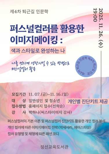 [메이저뉴스]정선교육도서관은 11월 26일, 고등학생과 일반 성인을 대상으로 제3차 퇴근길 인문학 “퍼스널컬러를 활용한 이미지메이킹 : 색과 스타일로 완성하는 나” 강연을 운영한다.