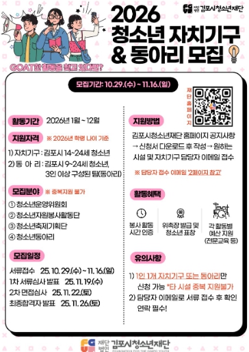 [메이저뉴스](재)김포시청소년재단에서 2026년 한 해 동안 김포시 청소년 수련시설을 함께 이끌어갈 청소년 자치기구 및 동아리 참여 청소년을 오는 10월 29일부터 11월 16일까지 모집한다.