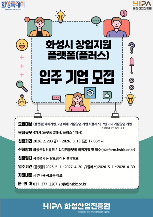 [메이저뉴스]화성산업진흥원(원장 전병선)은 동탄2 인큐베이팅센터 내 창업보육센터 ‘창업지원플랫폼’과‘창업지원플랫폼 플러스’ 입주기업을 오는 3월 13일까지 모집한다고 밝혔다.