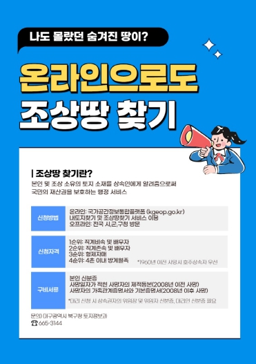 배광식 북구청장은 “조상땅 찾기는 복잡한 상속 절차 속에서 미쳐 알지 못했던 재산을 정확히 확인할 수 있는 유용한 서비스이며, 지속적인 홍보를 통해 구민의 재산권 보호에 도움이 될 수 있도록 힘쓰겠다”고 말했다.