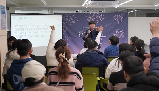 | ▲ 인천시청년미래센터가 지난 28일 퀘렌시아에서 마련한 ‘한 해 수고했 고은’ 행사에서 청년들이 퀴즈 맞히기를 하고 있다. |