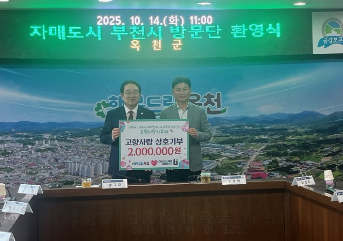[메이저뉴스]14일, 조용익 부천시장을 비롯한 부천시 충청권 정책현장 벤치마킹 방문단 24명이 ‘향수의 고장’ 옥천군을 방문했다. 이번 만남은 2002년 자매결연을 체결한 두 지역 간의 우호 증진과 교류 확대를 위한 자리로 마련됐다. 이날 옥천군과 부천시는 각 200만 원의 고향사랑기부금을 상호 기탁하며 두 지역의 발전을 함께 응원했다.
