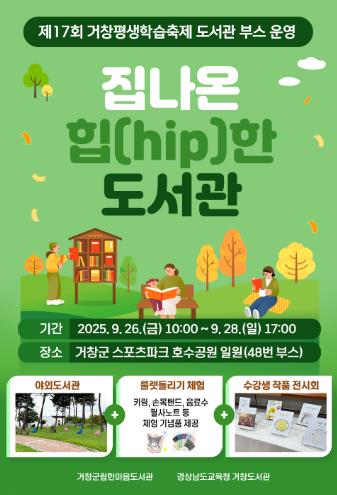 [메이저뉴스] 거창군립한마음도서관과 경상남도교육청 거창도서관은 오는 26일부터 28일까지 3일간 거창군 스포츠파크 일원에서 개최되는 제17회 거창평생학습축제 동안 『집나온 힙(hip)한 도서관』 부스를 운영한다고 밝혔다.