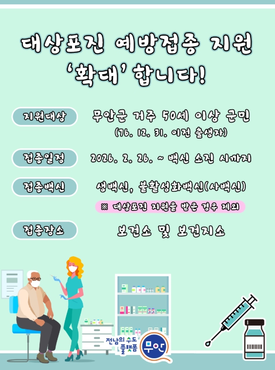 [메이저뉴스]무안군이 오는 23일부터 대상포진 예방접종 지원 대상을 확대한다.