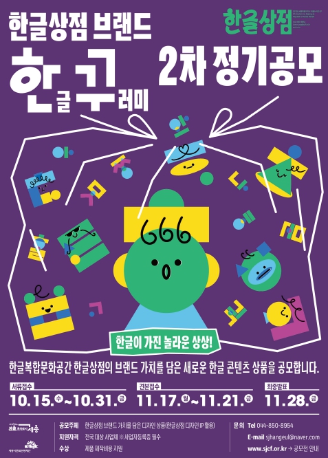 [메이저뉴스] 세종시문화관광재단은 한글복합문화공간 한글상점의 글자, 캐릭터를 활용해 한글의 조형적 아름다움을 새롭게 해석하고, 이를 디자인 상품으로 개발하기 위한 ‘한꾸(한글꾸러미)’ 2차 디자인 공모전을 개최한다.