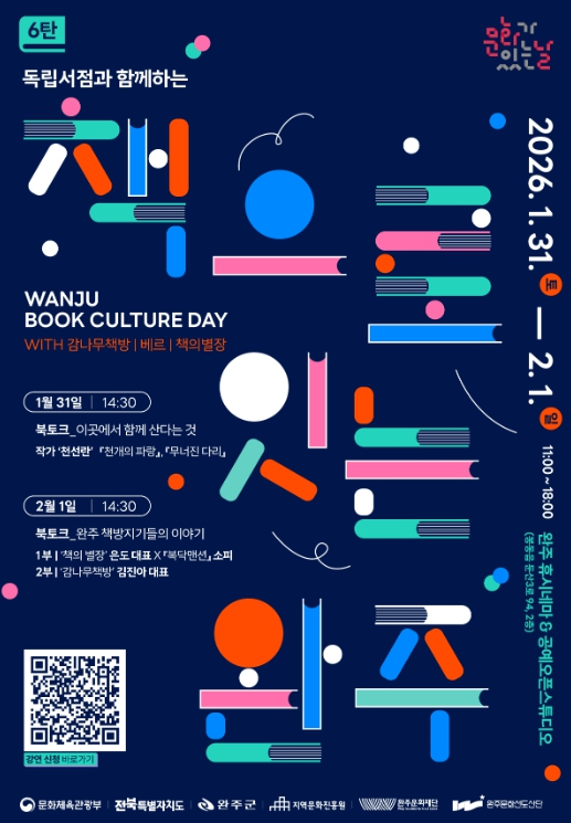 [메이저뉴스]완주문화재단은 오는 1월 31일부터 2월 1일까지 이틀간 완주 휴시네마와 공예오픈스튜디오에서 '문화가 있는 날 6탄 – 책으로 잇는 완주'를 개최한다.