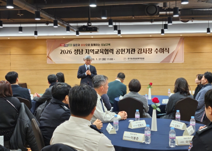 [메이저뉴스]경기도성남교육지원청은 1월 27일 스카이파크 호텔에서 '성남 지역교육협력 공헌기관 감사장 수여식'을 개최하여 성남교육 발전을 위해 협력해 온 지역교육협력기관 22곳에 감사의 뜻을 전했다.