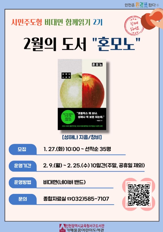 [메이저뉴스]인천광역시교육청서구도서관은 ‘2026년 시민주도형 비대면 함께읽기’ 2기 프로그램으로, ‘혼모노’ 함께 읽기를 2월 9일부터 2월 25일까지 운영한다.