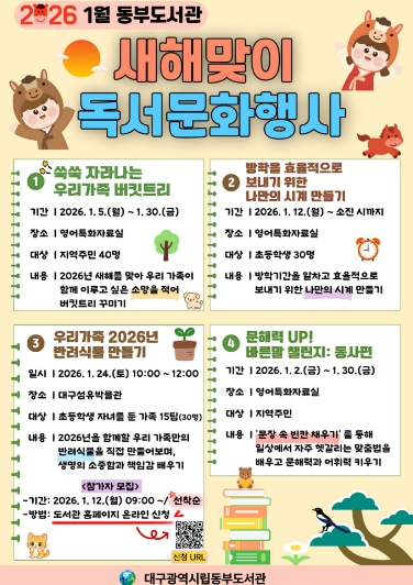 [메이저뉴스] 대구동부도서관은 다가오는 새해를 맞아 지역주민이 도서관에서 뜻깊은 한 해를 시작할 수 있도록 1월 한 달간 동부도서관 ‘새해맞이 특별 독서문화행사’를 운영한다.